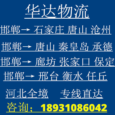 邯鄲到承德物流公司 |邯鄲物流公司 華達物流 電話0310-5510646手機18931086042專業提供邯鄲到承德物流專線運輸、整車運輸、零擔運輸、大件運輸、長途搬家以及易碎物品整理裝箱、家具電器拆卸打包等服務。10年物流運輸經驗,保證客戶零風險,一站式綜合邯鄲到承德物流服務,您值得信賴!