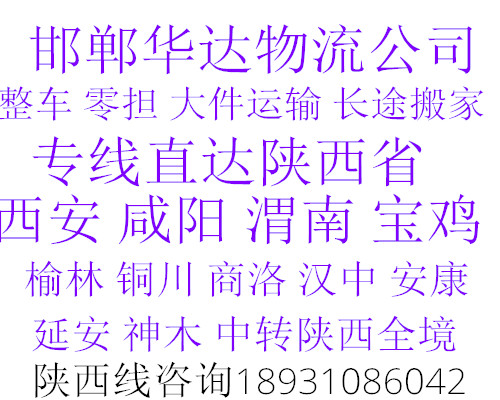 邯鄲到咸陽物流公司運費查詢:18931086042華達物流以一流的服務體系,本著安全,準時,互友,互惠的原則贏得市場,只要一個電話,一切由我公司操辦, 望廣大新老客戶給予大力支持、與我公司聯絡,我們將竭誠為您提供一切方便,歡迎來人來電咨詢!