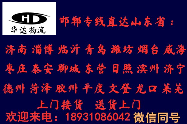 邯鄲到威海物流公司運費查詢:18931086042華達物流以一流的服務體系,本著安全,準時,互友,互惠的原則贏得市場,只要一個電話,一切由我公司操辦, 望廣大新老客戶給予大力支持、與我公司聯絡,我們將竭誠為您提供一切方便,歡迎來人來電咨詢!